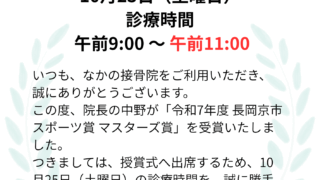 【お知らせ】 【重要】10月25日(土)診療時間変更のお知らせ いつも、なかの接骨院をご利用いただき、誠にありがとうございます。この度、院長の中野が「令和7年度 長岡京市スポーツ賞 マスターズ賞」を受賞いたしました。つきましては、授賞式へ出席するため、10月25日(土曜日)の診療時間を、誠に勝手ながら以... 2025.10.17 【お知らせ】